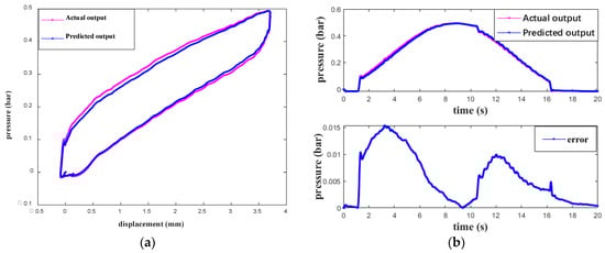 Fitting results of QUPI inverse model. (a) Fitting of length–pressure hysteresis loop. (b) Air pressure fitting diagram and real-time error diagram.