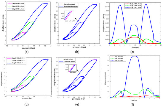When a load of 2 kg is applied to the end of the PAM, the sinusoidal pressure signal from Equation (19) is used to drive the PAM, resulting in the actual output displacement of the PAM. The input signal is then processed through the FN–QUPI model to predict the PAM’s output displacement. The hysteresis curves corresponding to three amplitude levels at 0.05 Hz and 0.1 Hz are obtained. The comparison between the actual hysteresis curves and the predicted PAM hysteresis curves, as well as the real-time error analysis for the three cases, are shown in Figure 9a–c and Figure 9d–f, respectively.