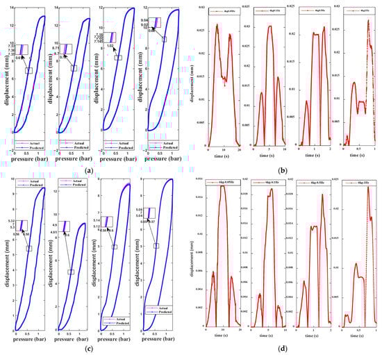 As the table indicates, the error magnitude is also in the order of 10−6 m, meaning the predicted output displacement of the model aligns very closely with the experimental data. Especially under lower frequency and lighter load conditions, the error is even smaller, further validating the accuracy of the model. This result not only proves the precision of the FN–QUPI model within the normal operating range of pneumatic artificial muscles (PAM) but also highlights the model’s effectiveness in dynamic system modeling. The FN–QUPI model is able to precisely capture the nonlinear dynamics of the PAM system, particularly under low-frequency and low-load conditions, where its high prediction accuracy showcases the model’s deep understanding and control of complex dynamic processes. Although the error increases under conditions of high load and high frequency, the FN–QUPI model still tracks the actual displacement changes of the PAM well, demonstrating its powerful ability to handle nonlinearities. This result further validates the advantages of the FN–QUPI model in managing complex nonlinear systems, indicating its wide application prospects and practical value, especially in scenarios requiring high-precision modeling and real-time control.