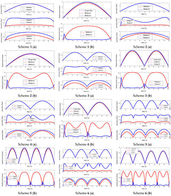 To verify the accuracy of the displacement tracking control strategy for the control methods proposed in this paper under different input signals of pneumatic artificial muscles, six sinusoidal input signals with different amplitudes and frequencies, as shown in Table 4, were selected and defined as Scheme 1 through Scheme 6. Based on these different input conditions, the performance of the two composite controllers was compared, with a focus on analyzing the performance of the two control methods under complex dynamic input conditions.