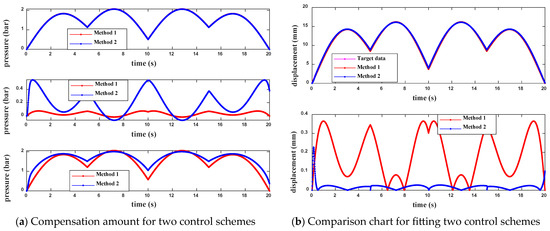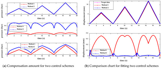 Figure 11 shows the PAM trajectory tracking results of the two controllers under the six schemes. In Figure 11, the three subplots in (a), from top to bottom, respectively, represent the feedforward control pressure compensation, the pressure compensation of the two feedback controls, and the total feedforward-feedback compensation. Comparing the results of the (a) plots across the six schemes reveals that when using the same feedforward scheme, the feedforward control pressure compensation for both control strategies is identical. However, the performance of the two feedback control strategies differs significantly, directly leading to a notable difference in the final total compensation. Part (b) of Figure 11 contains two subplots. From top to bottom, they show the fitting of the final output displacement to the desired displacement for the two control strategies, as well as the real-time error of the fitting.