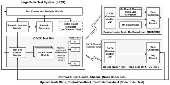 As shown in Figure 1, the C-V2X LSTS includes four functional entities: the scenario generator, rgw scenario injection module, the test control and analysis module, and the C-V2X testbed. The first three are run on the test central server, while the last one is deployed on the roadside.