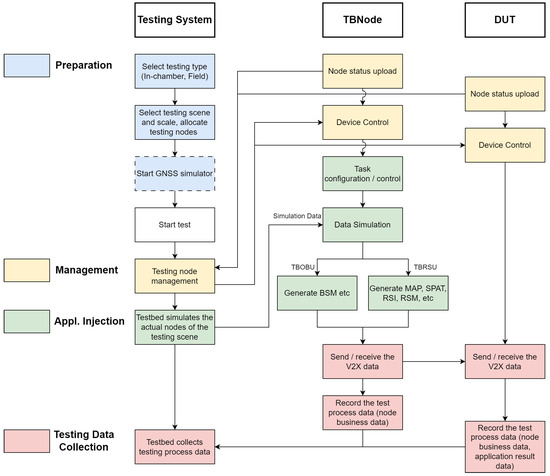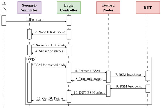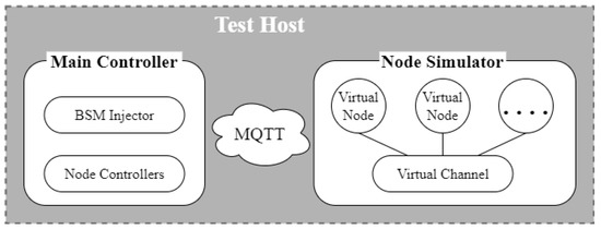 The control of nodes during testing is concurrent, asynchronous, and non-blocking. Given that C-V2X requires the periodic broadcasting of BSM, the network throughput in a C-V2X environment increases exponentially with the number of active nodes. In high-density scenarios, the TS must be able to manage concurrent data under high-load conditions. Therefore, network throughput testing is imperative to ascertain that the system’s throughput remains unsaturated during the concurrent operations of multiple nodes, ultimately preventing performance bottlenecks.