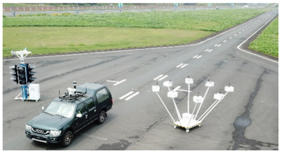 The TS is deployed in the experimental field of Chongqing Motor Vehicle Mandatory Test Center. The testing center has an internal enclosed road, as shown in Figure 10. It provides C-V2X DUTs from two Tier 1 suppliers, all installed on the vehicles under test.