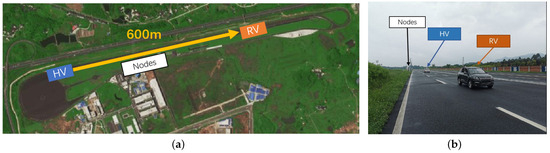 Figure 11 depicts the deployment of the test scenario, where a 600 m long straight road is selected for this test, with the RV and the HV positioned 600 m apart from each other. Two node arrays, which could simulate 200 vehicle nodes, are placed 50 m apart.