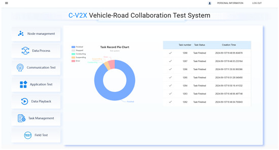 Once the hardware equipment is deployed, automated C-V2X testing, including test configuration, monitoring, and test results, can be achieved through an online GUI according to the system’s user instructions. Figure 12 displays the administrator login interface of the GUI. Administrator users can view all task executions and completions and access all task reports.