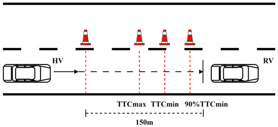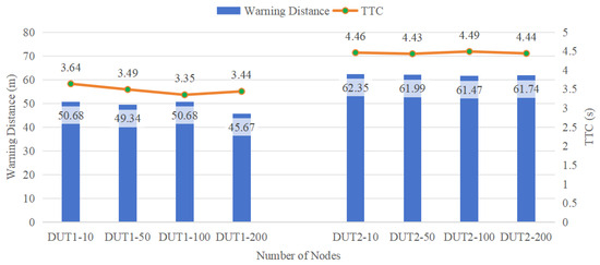 - Test RequirementsThe test requires that the DUTs have a communication range greater than 300 m, a data update frequency (i.e., transmission frequency) of less than or equal to 10 Hz, a system latency of less than or equal to 100 ms, and a positioning error of less than or equal to 1.5 m.The test expects the HV to issue a forward collision warning between the distance points marked in Figure 13, which are (≈55.56 m) and (≈29.17 m). Here, is 4 s, and is 2.1 s, as defined in DOT HS 811 501. TTC refers to Time To Collision.