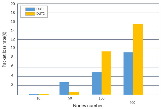 Figure 15. Packet loss rate.As shown in Figure 14, the FCW TTC value declines slightly with the increase in node density. Moreover, there were differences in response time TTC between products from different Tier 1 vendors. One possible reason for this is the difference between the application response algorithms. Nevertheless, the overall, TTC performance was relatively stable.As shown in Figure 15, the packet loss rate rises with the increase in node density. 3GPP has specified quantitative performance requirements for advanced V2X applications in TS 22.186; the reliability range for these applications is 90% to 99.999% [41]. This implies that, for V2X applications, the maximum packet loss rate should not exceed 10%, as a higher rate would indicate a severely degraded communication environment.Comparing Figure 14 and Figure 15, we can conclude that communication performance has a limited impact on response time TTC. Even when the packet loss rate reaches 15.6%, FCW response time TTC is also higher than the value, which is 2.1 s. The above test results prove the effectiveness of C-V2X technologies from another perspective.