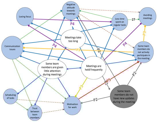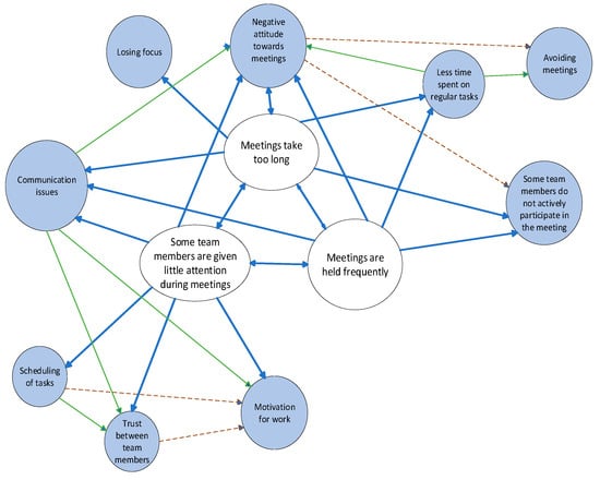 The next participant, P#4, stated that “loss of focus” should be associated with “less time spent on regular tasks” because if one does not have focus, one has no will to work, regardless of meetings. “Maybe connect that ‘meetings too often’ with ‘loss of focus’ because if you have meetings every two hours and you have to do something for a long time, you need better focus. If several times a day several meetings don’t go in order, and you have breaks between meetings, say an hour, you cannot perform your regular tasks attentively. If meetings are held frequently, meetings are skipped”.