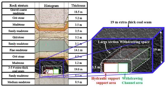 The mechanized mining height of the 8309 working face is 3.5 m, the height of top coal is about 15.5 m, and a withdrawal channel with a width of 3.8 m and a height of 3.5 m is constructed behind the stop line. In this paper, the support area of the hydraulic support and the withdrawal channel area are collectively referred to as the (large section) withdrawal space. A comprehensive histogram of coal and rock strata in the 8309 working face is shown in Figure 2.