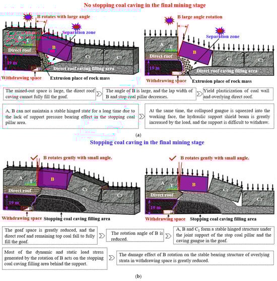 Mechanical model of key block stability under the condition of whether to stop coal caving or not. The B rock block is the key research block in this paper, and the stability of the B rock block is related to the stability of the surrounding rock in the underlying withdrawal space. Therefore, the B rock block is highlighted and changed to magenta.