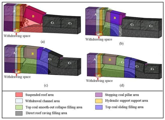 Reasonable stopping coal caving distance can slow down the rotation angle of fractured rock mass, weaken the influence of the dynamic and static load’s combined disturbance on the stable overburden environment of underlying withdrawal space during the rotation and subsidence of key blocks, and ensure the safe and efficient withdrawal of final mining hydraulic support. The selection principle of reasonable stopping coal caving distance is as follows: on the one hand, ensure that the goaf area below B is fully filled, and the rotation angle of B is small; on the other hand, the uncaving top coal and the caving direct roof collapse and slip to the lower part of C1 under the action of the B rotary extrusion and fill part of the goaf space below C1. The rotation angle of C1 is larger than that of B to a certain extent but it can ensure the transition to B and C2 and ensure the stable hinge between the key blocks. Therefore, the selection of stopping coal caving distance is closely related to the strike length (LZ) of the fractured rock mass of the final mining. In this paper, the LZ approximate the cycle weighting interval distance of the final mining period (26 m). The distance of stopping coal caving is summarized into the following four types—a: LC = 0 m; b: 0 < LC < LZ; c: LZ ≤ LC < 2LZ; d: LC ≥ 2LZ. Under the four typical stopping coal caving distances, the migration of the key blocks of the overlying basic roof in the withdrawal space is shown in Figure 4.