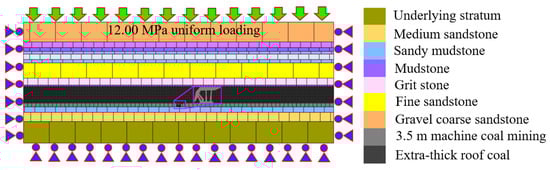 Numerical analysis model of extra-thick comprehensive caving working face. The dark blue hinge support in the diagram represents the velocity and displacement of the left, right and lower boundaries of the constraint model; the light green down arrow indicates that a uniform load of 12.0 MPa is applied to the model.