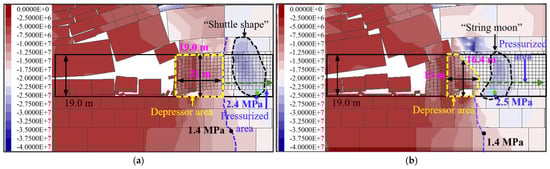 When the fracture position is located above the stopping coal pillar (Figure 12a), in terms of vertical stress, the overlying top coal and direct roof of the withdrawal space are almost all located in the depressor area, Di is 19 m and Do is 26.7 m. A “Carillon shape” stress-focused area is formed in front of the stopping coal pillar, and σw is 2.3 MPa. Due to the large plasticized area in front of the withdrawal space, σw is far away from the coal wall in front of the withdrawal space. In terms of maximum shear stress, the large-scale coal body in the shallow part of the stopping coal pillar is in the low-value area of maximum shear stress.