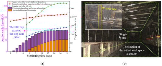 The deformation of surrounding rock and the stress of the anchor cable from the beginning of roadway excavation to the withdrawal of the working face are shown in Figure 16a. The maximum roof subsidence of the withdrawal space is 151 mm. The withdrawal space is completed on the fifth day and the stopping coal pillar is revealed. The maximum deformation of the stopping coal pillar is 82 mm before the withdrawal, and the deformation of the top wall meets the requirements of the safe and rapid withdrawal operation in the later period.