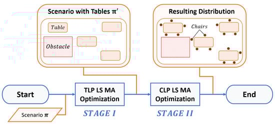However, the combinatorial explosion derived from the combined complexity of simultaneous optimization of the TLP and the CLP threatens the convergence to an acceptable solution. Therefore, in this paper, a sequential optimization methodology is proposed, as depicted in Figure 2. The sequential optimization is divided in two separate stages or phases, the first stage optimizes the TLP through an LS MA optimization based on the establishment scenario . The second stage takes as input the scenario with the optimally distributed tables by the previous stage, resulting in the desired chair and table distribution.