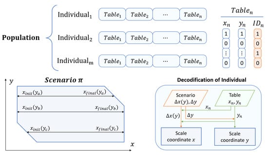 Each individual contains the Cartesian coordinates of each table over the given scenario. These values are coded in binary, which is a key design factor for future genetic operators of the MA. A binary to decimal scaled conversion is proposed for optimally surveying the given scenario, avoiding the location of tables outside the scenario boundaries in irregular establishments as proposed in []. Moreover, each table carries an ID tag for its identification during the LS and for the CLP optimization.