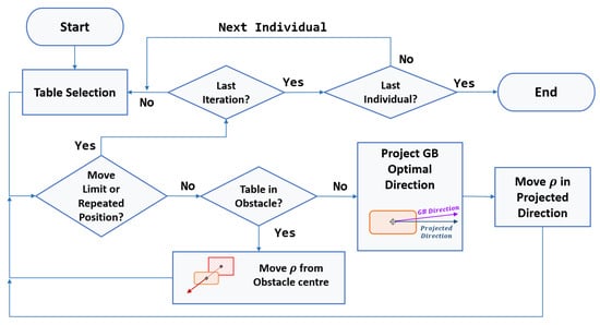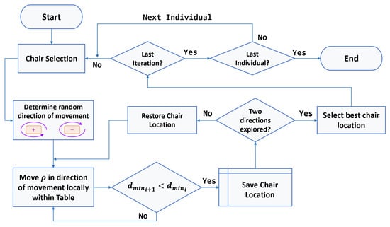 The purpose of the GBLS for the TLP is to improve the table distribution by introducing multiple small movements in certain table positions. Each movement is performed based on a step size and a movement direction. The obtention of the optimal movement direction for each chair constitutes a significant challenge, the presence of obstacles, the minimum distance restriction, and the exceeding number of possible configurations of distributions threaten the viability of any exact procedure [].