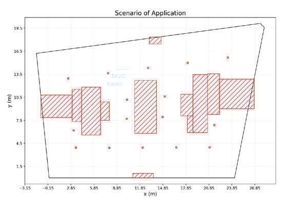 Case scenario for evaluating the performance of the proposed methodology. The red rectangles represent the obstacles where no chair or table should be placed.