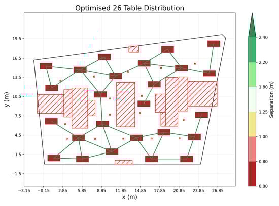 The outcome of the TLP optimization, depicted in Figure 9, represents the optimized table distribution for a total of 26 tables, a significant number of tables within the scenario of study while respecting the stated restrictions. This figure represents the result of the first stage of the sequential optimization approach, and also the starting point for the posterior optimization of the chair arrangement.
