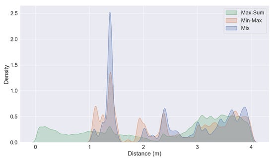 On the other hand, both the min-max and the mix optimization strategy attain valid distributions, reaching good metrics in mean and minimum distancing, with a low standard deviation. However, the min-max optimization method only focuses on improving the absolute minimum distance, and while the resulting mean value is also favorable, the obtained distance distribution is less efficient than that attained by the mix strategy, as depicted in Figure 10.