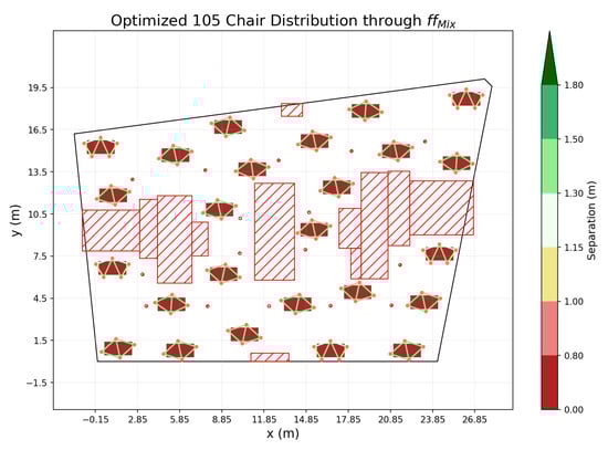 The achieved distance distribution from the proposed methodology is desirable both for decreasing the contagion probability and also for providing a more pleasant and attractive distribution for the establishment, where a certain degree of symmetry and order is appealing to the customer. The described order can be appreciated within the resulting chair distribution, shown in Figure 11, where a certain pattern is repeated throughout the tables.