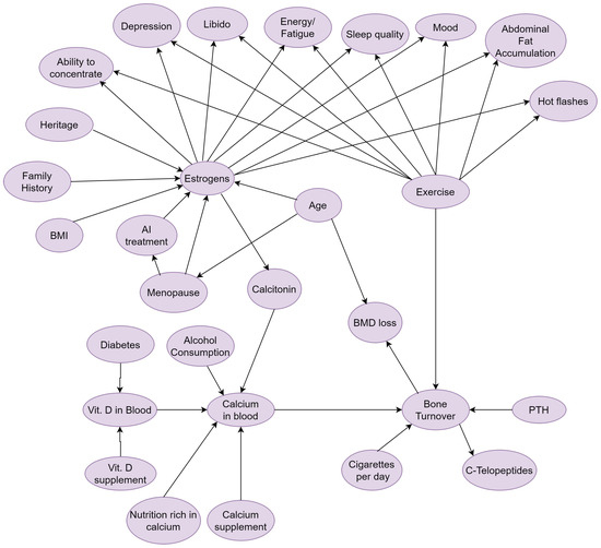Figure 2 presents the developed DAG for the “Osteopenia and Osteoporosis” use case, which aims to study various factors contributing to bone mineral density (BMD) loss (and increased risk of fractures) in BCPs, especially for those who undergo AI treatment. For measuring the variable BMD loss, we consider the T-score. The value of the T-score [48] on a patient’s bone density report suggests the difference, in standard deviations, from the bone mineral density of the average of healthy 30-year-old women. According to the World Health Organization (WHO), normal ranges are between −1.0 and +4, while a T-score between −2.5 and −1.0 is considered to indicate low bone density, or else osteopenia. Finally, a T-score below −2.5 indicates that the patient has osteoporosis. The functional relationships between the linked variables are learned from the available data, resulting in a model that can be used to assess the effect of various QoL-related parameters on BMD loss. Details regarding the DAG are provided in Section 4.1 and in the Appendix A. In this paper, the DAG is used for data generation purposes, to synthesize the dataset used in the experiments.