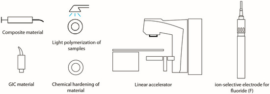 In general, the changes in various restorative materials caused by radiotherapy are the result of a combination of “destructive” processes, e.g., breaking of chains by high energy [33] or “constructive” processes and improvements in the degree of transformation and cross-linking [34], which are also caused by high-energy photons. It is possible that this can lead to change in fluoride release, but we cannot exclude the possible combined output of these two things, which have opposite effects on material properties. Since only the combined net effect can be measured experimentally, it is difficult to separate the relative contribution of the “destructive” and “constructive” processes, and it is almost impossible to predict which of the two processes will dominate in a given material without empirical testing.