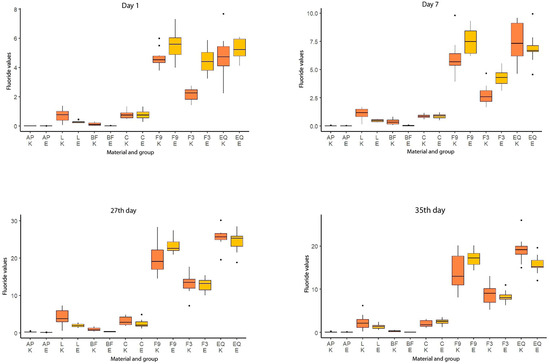 Distribution of the fluorine values shown by box-plot diagrams for the 1st, 7th, 27th, and 35th days of measurement according to the material and group (K = control, E = experimental).