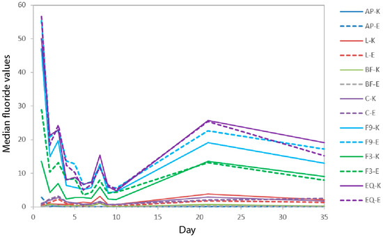 Mean values (median) of fluorine according to measurement day, material, and group (K = control/non-irradiated, E = experimental/irradiated).