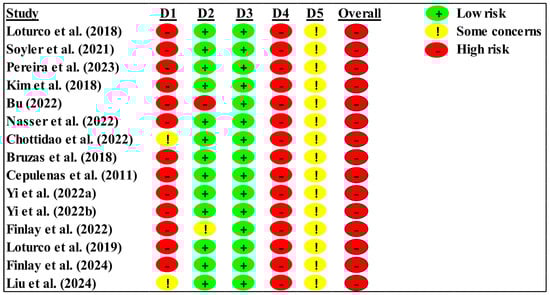 Risk of bias within studies [18,19,20,21,22,36,59,60,61,62,63,64,65,66,68]. Legend: D1: randomization process; D2: deviations from the intended interventions; D3: missing outcome data; D4: measurement of the outcome; D5: selection of the reported result.