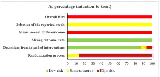 The risk of bias in individual studies was assessed using the Cochrane risk of bias (RoB 2) [57]. Two authors (I.C.C., J.H.M.) independently completed the RoB analysis, which was reviewed by a third author (T.H.V.). In the original articles, if inconsistencies arose, the procedure was to analyze them until a consensus was reached. However, this was not necessary.