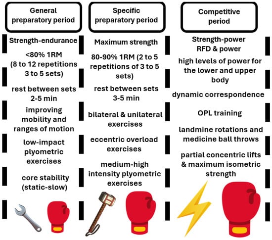 At the beginning of the training cycle or “camp”, in line with Beattie et al.’s [6] recommendations, a period of “strength-endurance” can be applied with the aim of adapting the athlete to more intense loads in the later phases, improving mobility and ranges of motion along with the technique of traditional overload exercises (e.g., squat, deadlift, bench press, pull-ups) and exercises derived from weightlifting (e.g., power clean, snatch, split jerk or one-arm variations, such as the kettlebell unilateral snatch). Regarding traditional muscle strength exercises, these can be started with a load of <80% of 1RM (e.g., 8 to 12 repetitions, 3 to 5 sets with a 2 to 5 min rest between sets) to accumulate base strength in the athlete. A linear load progression is an optimal strategy for developing strength in boxers [123]; however, with more experienced athletes it is valid to include an undulating load progression [124]. Due to the different weight categories in boxing, caution must be taken with the prescription of training volume, given that athletes may gain muscle mass and increase their need to execute rapid weight loss procedures to compete in their original weight categories [6]. Evidence has been reported that a morphological increase in the muscle cross-sectional area supports the development of maximal muscle strength and explosive strength [103]. Despite this, the maximum force is not only dictated by this mechanism, but also by neuronal factors such as the recruitment of motor units and the discharge frequency [103,125].