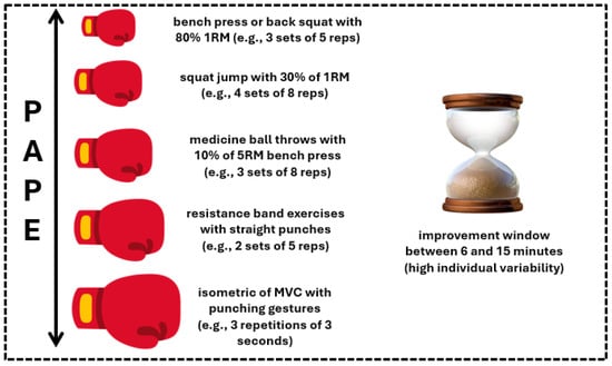 It is possible to improve punches’ impact force both chronically and acutely. Before fights or sparring sessions, maximal isometric exercises can be integrated with punching techniques (e.g., three repetitions of 3 s), resistance band exercises with punching techniques (e.g., two sets of 5 reps), medicine ball throws with 10% of 5RM bench press (e.g., three sets of 8 reps), SJ with 30% of 1RM (e.g., four sets of 8 reps) and traditional exercises such as bench press and back squat with 80% of 1RM (e.g., three sets of 5 reps) with an improvement window in punches’ impact force between 6 and 15 min after the exercises.