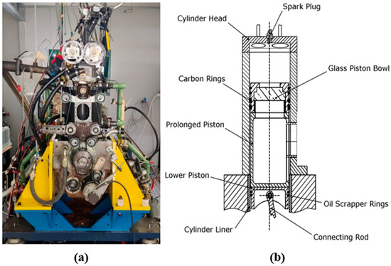 The measurements were conducted on a 500-cc single-cylinder research engine, shown in Figure 1, charactered by a pent-roof combustion chamber with four valves and a reverse tumble intake port system precisely crafted for operation in port fuel injection (PFI) [32] mode. Moreover, the engine features a stroke of 88 mm, a bore of 85 mm, a connecting rod length of 139 mm, and a compression ratio of 8.8:1. Additional detailed information about the test engine can be found in [33,34] and in Table 1.