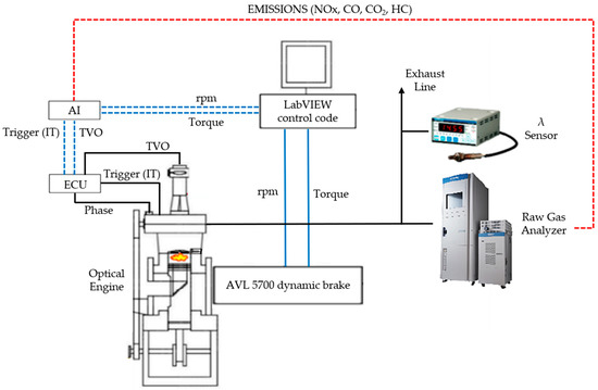 A Horiba MEXA-7100D with an OVN-723A was used to conduct the exhaust gas analysis. The general schema of the experimental setup employed, including the inputs and outputs for the analyzed nets, is presented in Figure 2, with further details and specifications provided in Table 2.