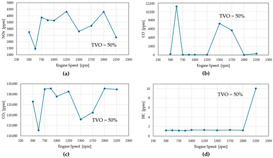 The trend in the (a) NOx, (b) CO, (c) CO2, and (d) HC concentration at the exhaust pipe, for different engine speeds, with one particular operating condition taken as an example (i.e., TVO = 50%).