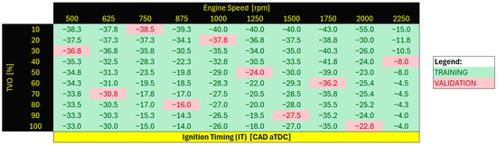 Engine map. Green operating points were used for training, and red operating points were used for validation.