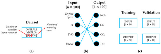 Based on the observations previously outlined and presented in Table 3 and Figure 4, Figure 5 shows the division of the primary dataset into training and validation subsets, comprising [100 × 4] input variables and [100 × 4] output variables. The dataset is composed of 100 experimental cases, as detailed in Table 3, with each case defined by 8 variables (Figure 5a). The input parameters (i.e., engine speed, IT, TVO, and torque) are organized into a [4 × 100] matrix, while the output parameters (i.e., NOx, CO, CO2, and HC) are represented by another [4 × 100] matrix; see Figure 5b. The dataset was partitioned so that 90% of the data were utilized for training and the residual 10% were reserved for validation (Figure 5c).