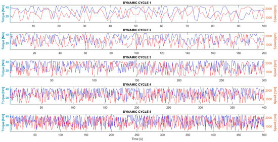 Specifically, as depicted in Figure 6, 5 distinct dynamic cycles have been defined, each characterized by a unique road path, particularly concerning variations in engine speed (red curves) and torque (blue curves) and different durations, as specified in Table 3. These differences have been carefully considered to ensure a comprehensive analysis of the network’s predictive capabilities for the pollutant concentrations at the exhaust pipe across varying operating conditions.
