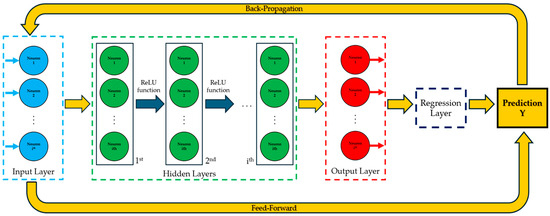 To assess the precision and performance of the model’s parameters, the root mean square error (RMSE), which represents the average squared differences between predicted values and observed values, has been employed as the primary metric for measuring loss (Equation (1)). In regression problems, it is common practice to also employ additional metrics, such as the mean squared error (MSE) and the mean absolute error (MAE), to further evaluate model performance.