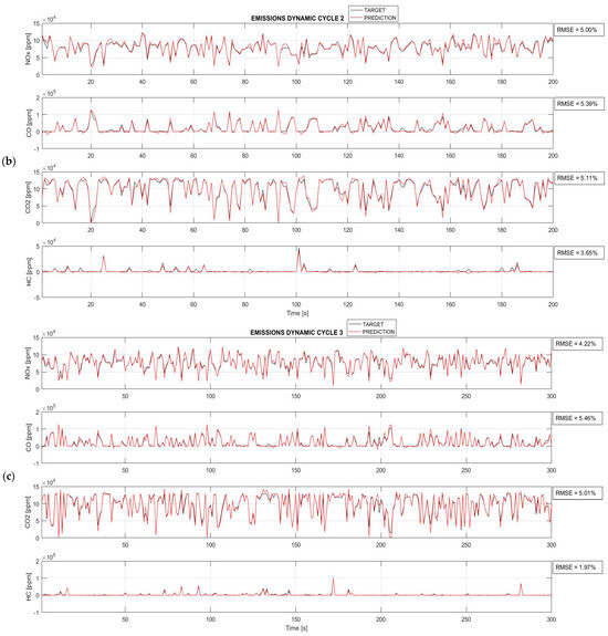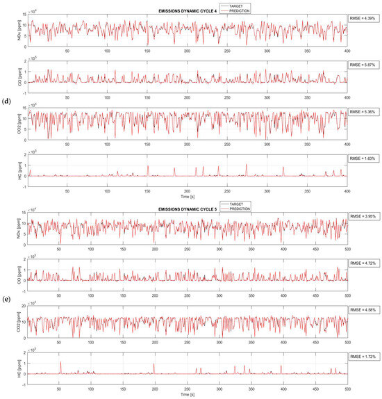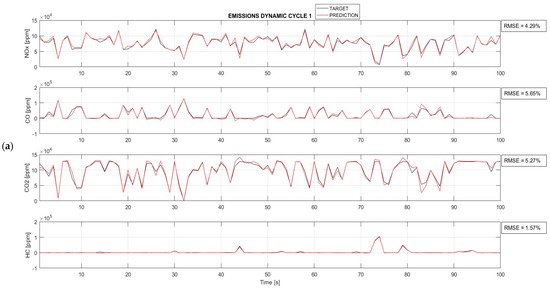 As illustrated in Figure 9, where the red curves depict the predictions generated by the network and the black curves represent the experimentally obtained target values, the BPANN architecture demonstrates a remarkable ability to accurately replicate the emission trends for each dynamic cycle and every pollutant analyzed. Upon closer examination, it is evident that for all the cases studied, the RMSE remains significantly below the acceptable threshold of 10%, never exceeding 6%. Specifically, the highest RMSE, observed in the prediction of CO for dynamic cycle 4 (Figure 9d), is 5.87%, while the lowest, at 1.57%, is observed in the prediction of HC for dynamic cycle 1 (Figure 9a).