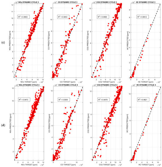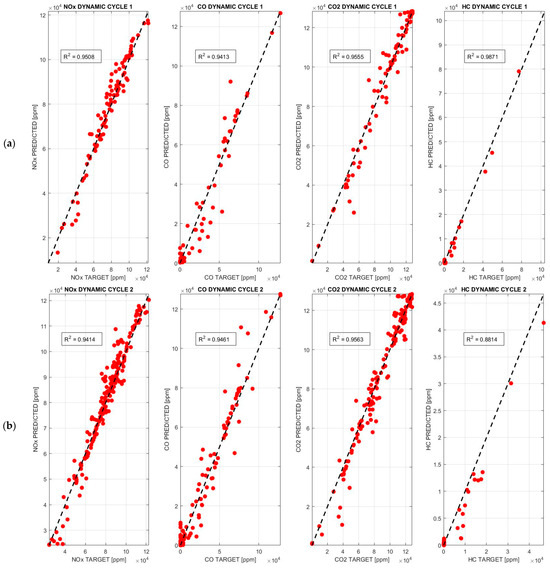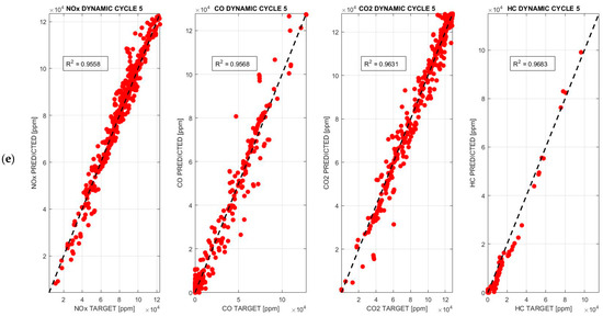 In accordance with the observations made in Figure 9 and Table 4, the BPANN demonstrates a consistent alignment along the interpolation line, with no significant deviations, for all pollutants analyzed across each dynamic cycle, thereby achieving exceptionally high accuracy. It is noteworthy that this architecture displays very little dispersion, with R2 values becoming close to unity, definitely > 0.93, for all pollutants analyzed across each dynamic cycle: the highest R2 value, 0.9871, is observed for HC emissions in dynamic cycle 1, while the only exception is the HC emission value in dynamic cycle 2, with an R2 = 0.8814.