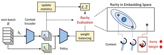 An overall framework of Balanced Domain Randomization (BDR). BDR reweights training domains based on their rarity in the embedding space. The framework uses a context encoder to capture contextual information about the current environment from a recent history of state–action pairs. The rarity evaluation module estimates the rarity of each context, adaptively adjusting the weight assigned to each domain. This ensures that rare scenarios are sufficiently visited during training.