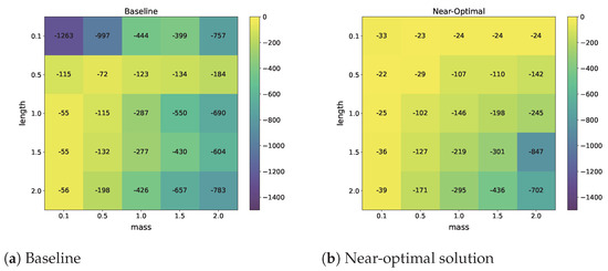 Episodic returns of the baseline and near-optimal policies in the pendulum task. The number in a cell indicates the average episodic return in each domain. The baseline policy (a) exhibits lower returns when the pendulum length is 0.1 compared to the near-optimal policies (b), demonstrating that policies trained under domain randomization tend to prioritize specific domains over others even though domains are uniformly sampled.