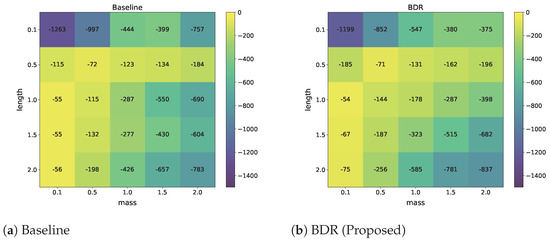 Figure 3 and Figure 4 show the average episodic return for each domain in the Pendulum and Walker tasks, respectively. We observe that the improvements are especially evident in domains with extreme conditions, such as the low length in the Pendulum task and the low gravity in the Walker task. Specifically, when the length is 0.1 in the Pendulum task, the BDR achieves an average episodic return of −670.6, outperforming the baseline, which exhibits an average return of −772. This represents a 13.13% improvement. When the gravity is 1 in the Walker task, the BDR improves an average episodic return by 11.38%, achieving an average episodic return of 763.4 while the baseline only achieves an average return of 685.4.