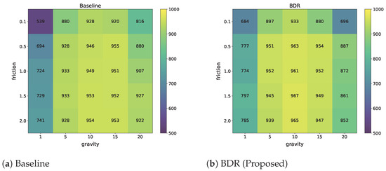 Episodic returns of the baseline and BDR in the Walker task. The BDR (b) improves performance, particularly when the gravity is 1, where the baseline policy (a) struggles.