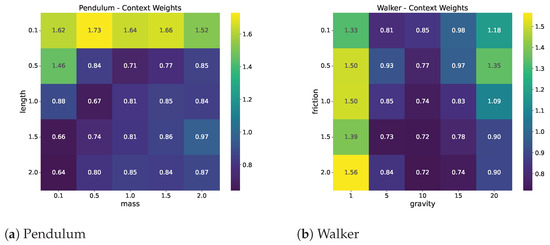 Weight assignment. We also analyze how BDR adjusts the weights for training samples from different domains. Figure 5 visualizes the average sample weights assigned to each domain. The analysis indicates that BDR gives higher weights to domains with smaller lengths in the Pendulum task (Figure 5a) and lower gravity in the Walker task (Figure 5b). It demonstrates that BDR effectively targets and emphasizes rare domains where the baseline performs poorly by measuring the rarity in the embedding space.