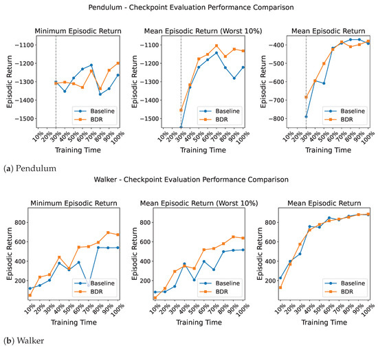 Performance trends of the baseline and BDR over training time. In both the Pendulum and Walker tasks, BDR consistently outperforms the baseline in worst-case performance (minimum episodic return and mean episodic return in worst 10%) while maintaining average-case performance (mean episodic return) during training.