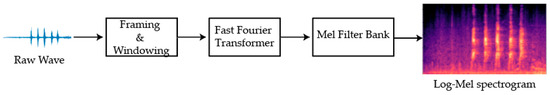 Introducing background noise during model training can help the model better adapt to various environments and noises [27]. The statistical characteristics of Gaussian distribution white noise are similar to those of background noise in many natural environments. Therefore, additive white Gaussian noise (AWGN) is often chosen as a high-quality option for simulating environmental background noise in this domain [27]. First, AWGN is incorporated into the original audio to serve as background noise. Secondly, Log-Mel spectrograms are extracted from both the original and the noise-added audio. The Log-Mel spectrograms are used as input for the Transformer model, which can be conceptualized as a temporal sequence, where each temporal instant encapsulates key features spanning diverse frequency dimensions [28]. The Transformer model enhances the Log-Mel spectrogram by incorporating positional information into the time dimension. It is quite convinced that this structure dynamically reallocates weights on a large scale to capture global information and long-term dependencies within the audio signal based on the adaptive attention mechanism. Therefore, using Log-Mel spectrograms as input for the Transformer model fully leverages the advantages of both, enabling efficient processing of audio signals. Figure 1 shows the extraction process of the Log-Mel spectrogram.